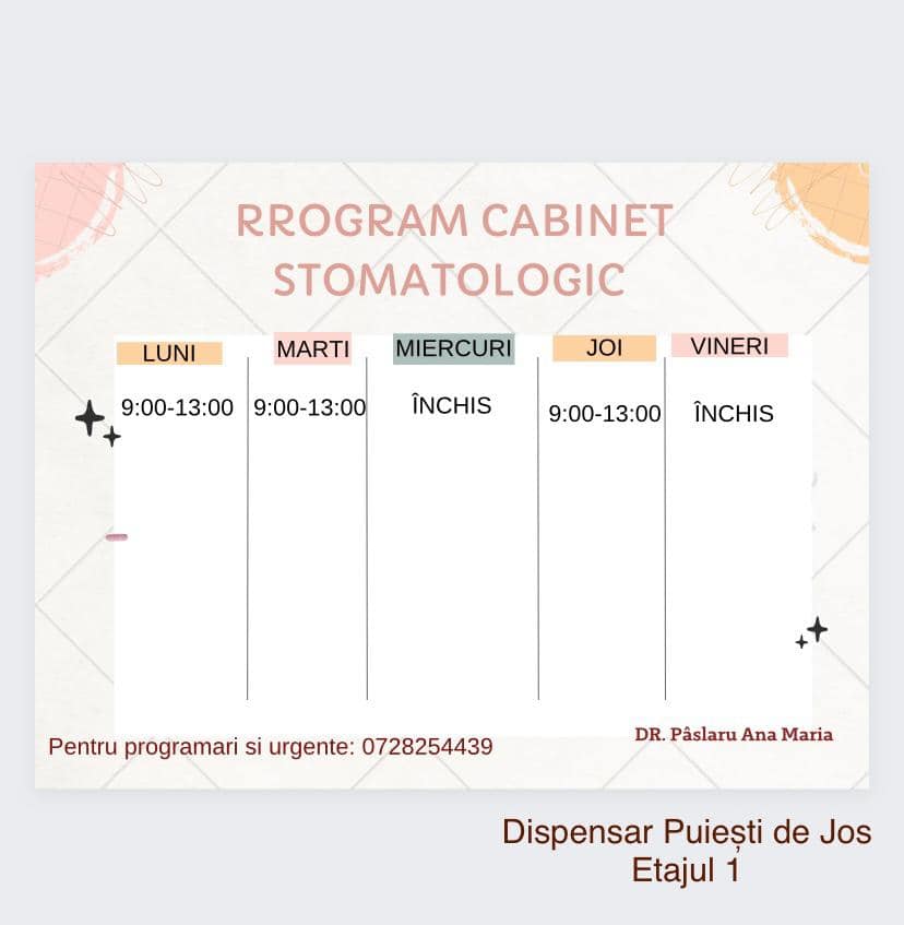 Pentru programări și urgențe sunați la numărul de telefon 0728 254439, Dr Pâslaru Ana Maria.