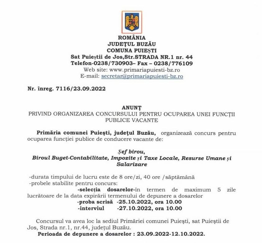1. Șef birou în cadrul biroului Buget Contabilitate, Impozite și taxe locale, Resurse umane și Salarizare. Informații suplimentare referitoare la condițiile de ocupare a funcției publice, bibliografie, tematica de concurs și atribuțiile postului găsiți pe site-ul primăriei www.primariapuiesti-bz.ro, secțiunea Carieră.