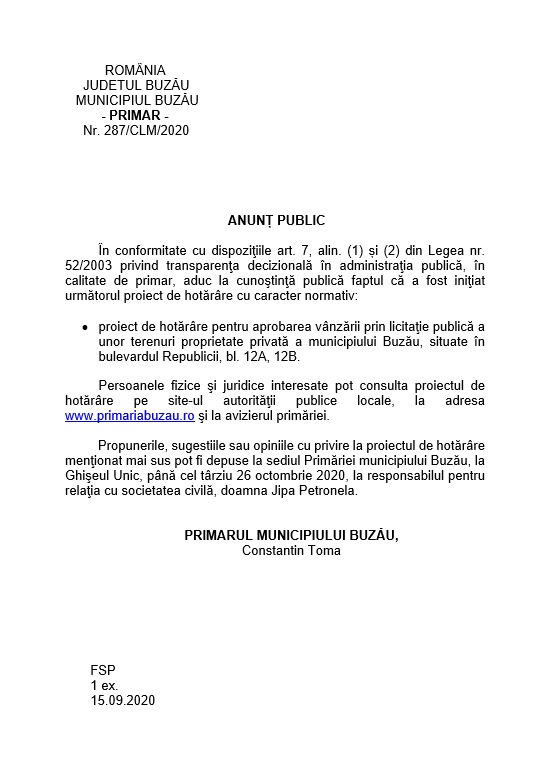 ANUNTURI BUZAU Primăria Municipiului Buzău – anunț public 15 septembrie 2020 de Stiri Buzau Media DISTRIBUIE Stiri Buzau Media 16 septembrie 2020 15 septembrie 2020 Articolul anterior Noi măsuri în starea de alertă: ce trebuie să facă alegătorii care vin la vot pe 27 septembrie Articolul următor LISTĂ: Delimitarea și numerotarea secțiilor de votare la Râmnicu Sărat Buzăumedia pe Facebook Ultimele știri Compania de Apă Buzău: 19 noiembrie marchează „Ziua Mondială a Toaletei” ADMINISTRATIV ANUNTURI BUZAU STIRI BUZAU Primăria Grebănu: INFORMARE ADMINISTRATIV STIRI BUZAU Rețeaua de echipamente de colectare selectivă a deșeurilor se extinde în județul Buzău! STIRI BUZAU Facilității pentru noi investiții, în Buzău, în contextul deschiderii Autoztrăzii Moldovei! STIRI BUZAU Spitalul Județean Buzău va avea un nou director medical! STIRI BUZAU Buzoianca Beatrice Romanescu, vicepreşedinte al Federaţiei Internaţionale de Tenis de Masă! STIRI BUZAU Trans Bus Buzău: Card bancar – gasit in autobuzul Transbus pe linia 5 ADMINISTRATIV ANUNTURI BUZAU STIRI BUZAU Compania de Apă Buzău: Topul Firmelor din Județul Buzău, ediția 2025, i-a celebrat pe toți cei care susțin economia locală ADMINISTRATIV ANUNTURI BUZAU STIRI BUZAU Trans Bus Buzău: 𝐎𝐛𝐢𝐞𝐜𝐭 𝐠𝐚̆𝐬𝐢𝐭 𝐢̂𝐧 𝐚𝐮𝐭𝐨𝐛𝐮𝐳𝐮𝐥 𝐓𝐫𝐚𝐧𝐬𝐛𝐮𝐬 𝐩𝐞 𝐋𝐢𝐧𝐢𝐚 28 ADMINISTRATIV ANUNTURI BUZAU STIRI BUZAU Constantin Croitoru: Fără sprijinul lui Marcel Ciolacu, multe realizări nu ar fi fost posibile! STIRI BUZAU