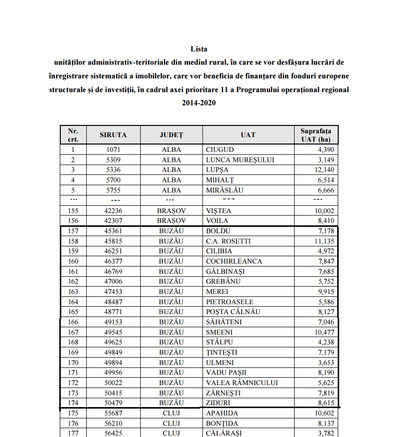 Localitățile care vor beneficia de aceste fonduri au fost alese de o comisie din care fac parte specialiști din Ministerul Dezvoltării Regionale, Administraţiei Publice şi Fondurilor Europene, Ministerul Agriculturii şi Dezvoltării Rurale, Ministerul Transporturilor, dar și din cadrul Agenției Naționale de Cadastru și Publicitate Imobiliară. Membrii comisiei interministeriale au fost desemnați de primul-ministru. Agenția Națională de Cadastru și Publicitate Imobiliară a publicat recent lista comunelor care vor beneficia de cadastrare integral din fonduri externe nerambursabile. La nivelul județului Buzău, 18 localități se află pe această listă – Boldu, C.A.Rosetti, Cilibia, Cochirleanca, Gălbinași, Grebănu, Merei, Pietroasele, Poșta Câlnău, Săhăteni, Smeeni, Stâlpu, Țintești, Ulmeni, Vadu Pașii, Valea Râmnicului, Zărnești și Ziduri.