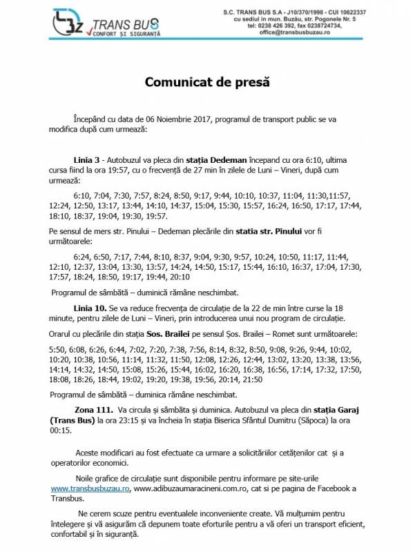 Urmare a solicitărilor venite din partea buzoienilor și agenților economici, începând de luni, 06 noiembrie, Trans Bus modifică programul de transport public. Totodată, societatea mai anunță că frecvența minutelor de așteptare a călătorilor în stații va înregistra o scădere. Iată modificările ce vor fi realizate din 6 noiembrie: