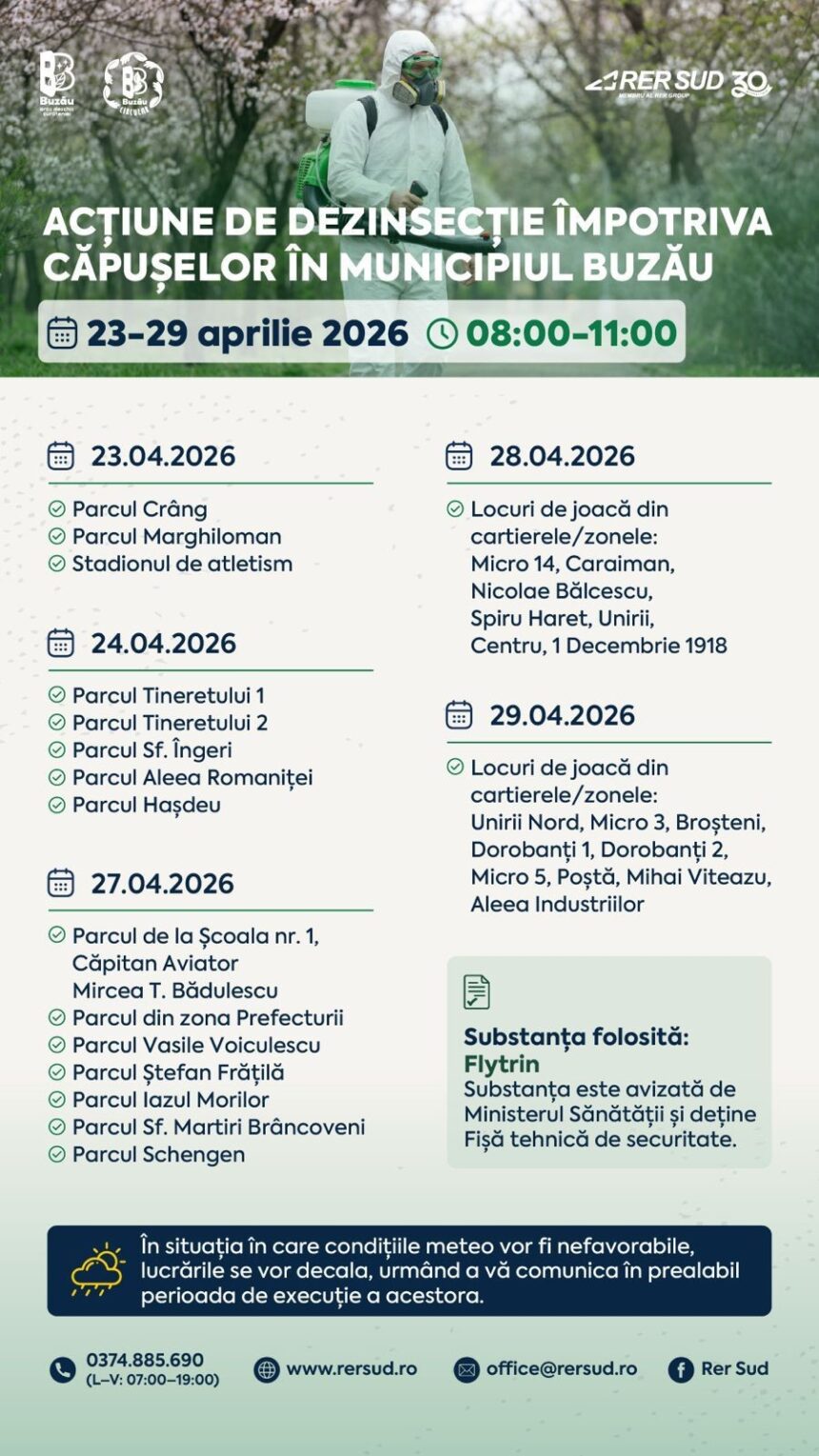 Activitățile de dezinsecție se vor desfășura în perioada 23 – 29 Aprilie, în intervalul orar 08:00 – 11:00. Pe perioada de execuție a dezinsecției, cetățenii sunt rugați să nu tranziteze/staționeze în zonele de acțiune. În cazul în care condițiile meteo vor fi nefavorabile, activitatea va fi decalată, urmând a comunica opiniei publice perioada de execuție a lucrărilor.