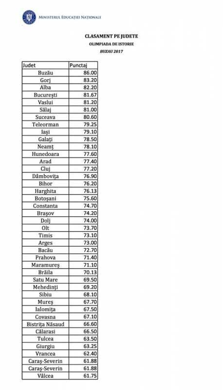 Conform clasamentului întocmit de comisia de concurs, Buzăul ocupă prima poziție, cu 86 de puncte, urmat de Gorj, cu 83.20 și de Alba, cu 82.20 puncte. De asemenea, la proba scrisă, Andreea Stanciu, elevă în clasa a XII-a la Colegiul Național „B.P Hasdeu”, pregătită de profesorul Dănuț Solcan, a reușit să obțină premiul al III-lea, cu 87 de puncte.