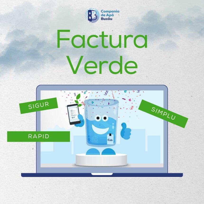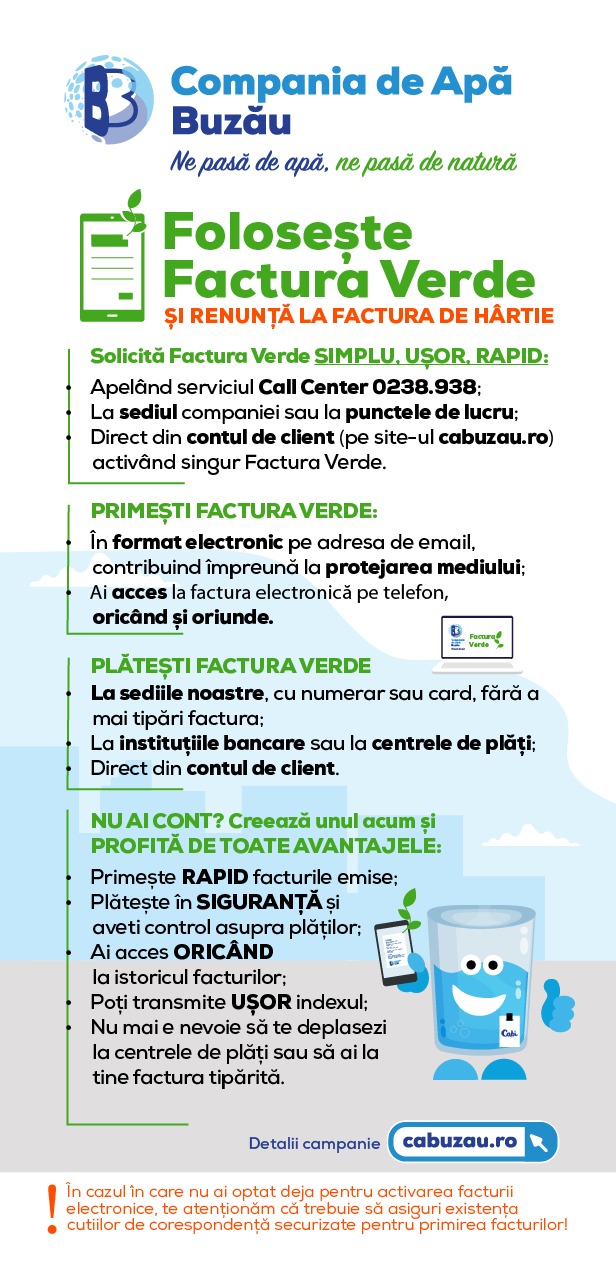 Factura electronică se primește pe e-mail și poate fi vizualizată de pe orice dispozitiv. Poate fi achitată online, pe site-ul operatorului regional (cabuzau.ro) sau la sediul Companiei de Apă Buzău, la instituțiile bancare sau la centrele de plăți.