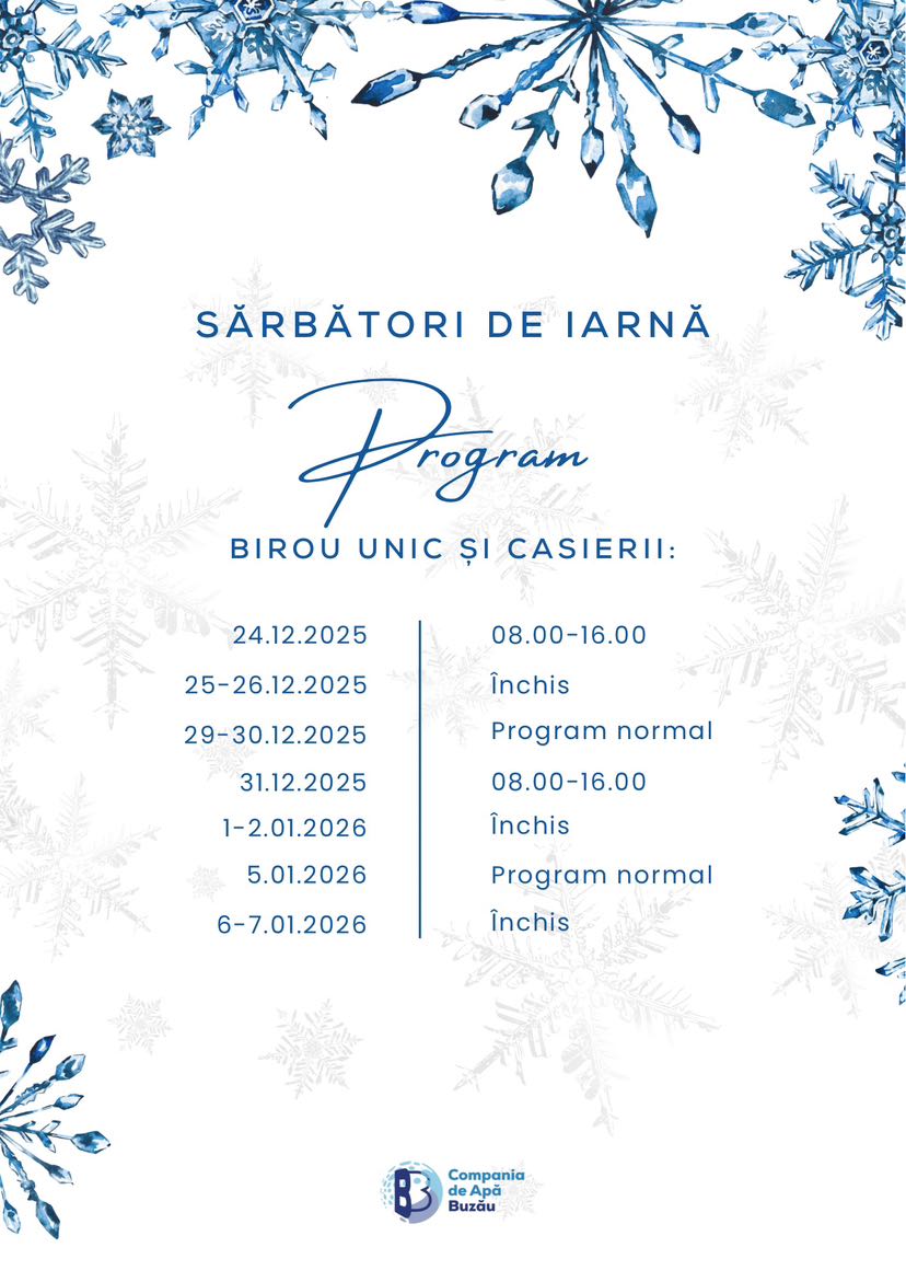 Pentru serviciile oferite prin Biroul Unic și Casierii, programul va fi cel din imagine.