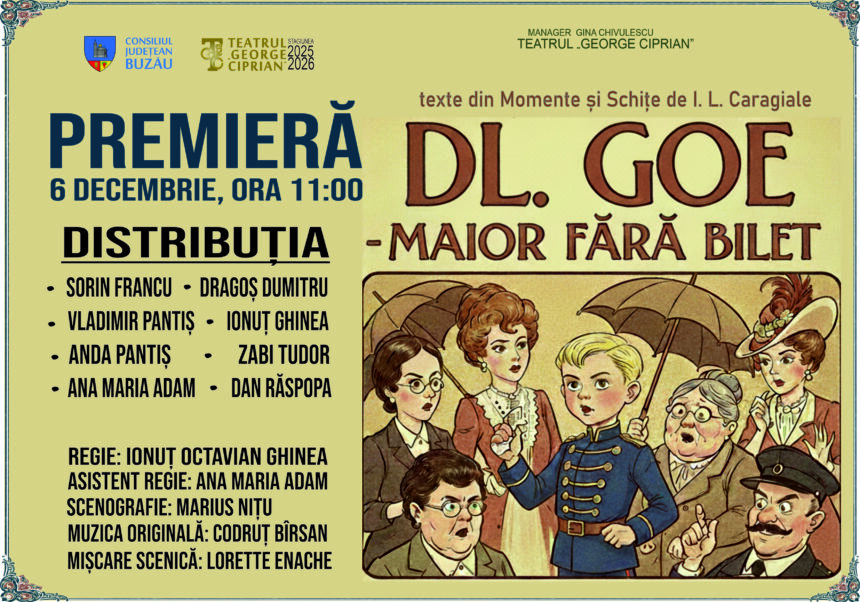 Teatrul „George Ciprian” din Buzău aduce pe scenă spectacolul „Dl. Goe, Maior fără bilet”, de Ion Luca Cragiale, păstrând comicul de situație condensat într-un flux continuu, alert, cu muzică originală și momente coregrafice care pun în valoare grotescul „lanțului de favoruri” făcând o distincție între copilul Ionel și „copiii” de astăzi crescuți cu scurtături: părinți care negociază note, examene „aranjate”, diplome fără merit. „Maiorul fără bilet” devine simbolul generațiilor care au învățat că „se poate și altfel” – dar descoperă că „altfelul” are costuri mult mai mari în viață.
