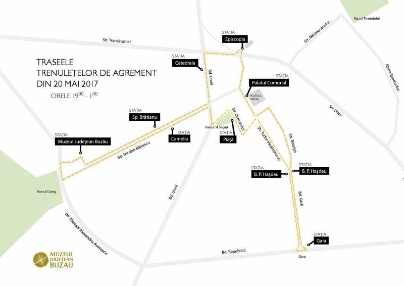 Pentru ca publicul să aibă timp să parcurgă toate obiectivele deschise în municipiul Buzău, organizatorii pun la dispoziţie două trenuleţe de agrement ce vor circula între orele 19.00-01.00 pe traseul Muzeul Județean Buzău – bd. Nicolae Bălcescu – bd. Unirii – str. Aleea Trandafirilor – str. Ostrovului – str. Independenţei – str. Tudor Vladimirescu – bd. Gării – Gară – bd. Gării – Colegiul Naţional „B.P. Hasdeu” – str. Bistriței – str. Ion Băieșu – str. Tudor Vladimirescu – Rond Arhiepiscopie (rond Obor) – str. Obor – bd. Unirii – bd. Nicolae Bălcescu – Muzeul Județean Buzău.