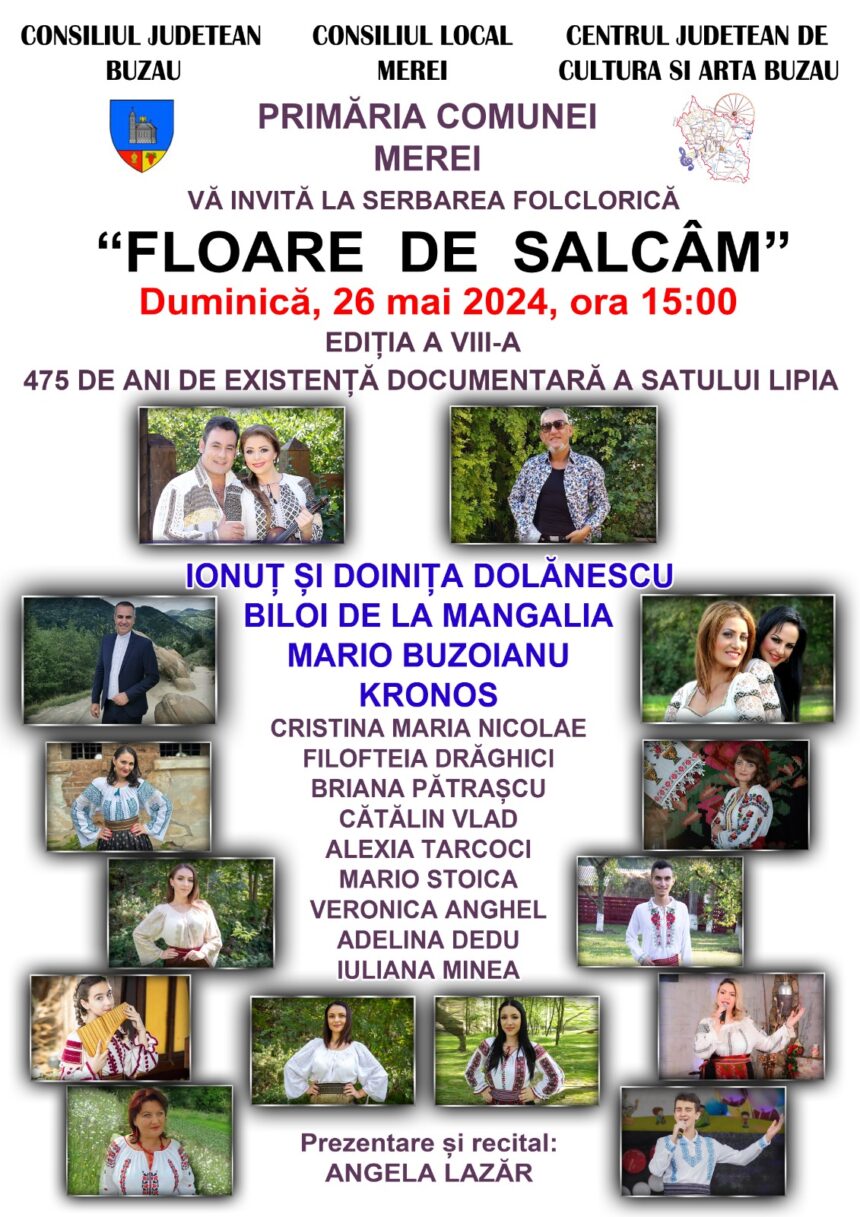 Duminică, 26 mai, sunteți invitați la festival! Cântec, joc și voie bună, la Lipia, pe terenul de sport din localitate. Totodată, se vor sărbători 475 de ani de atestare documentară a comunității. Primarul Ștefan Chircă vă invită să-i urmăriți pe Ionuț și Doinița Dolănescu, Mario Buzoianu, Kronos, Cristina Maria Nicolae și mulți, alți cântăreți îndrăgiți de dvs! Evenimentul se va încheia cu un spectaculos foc de artificii.