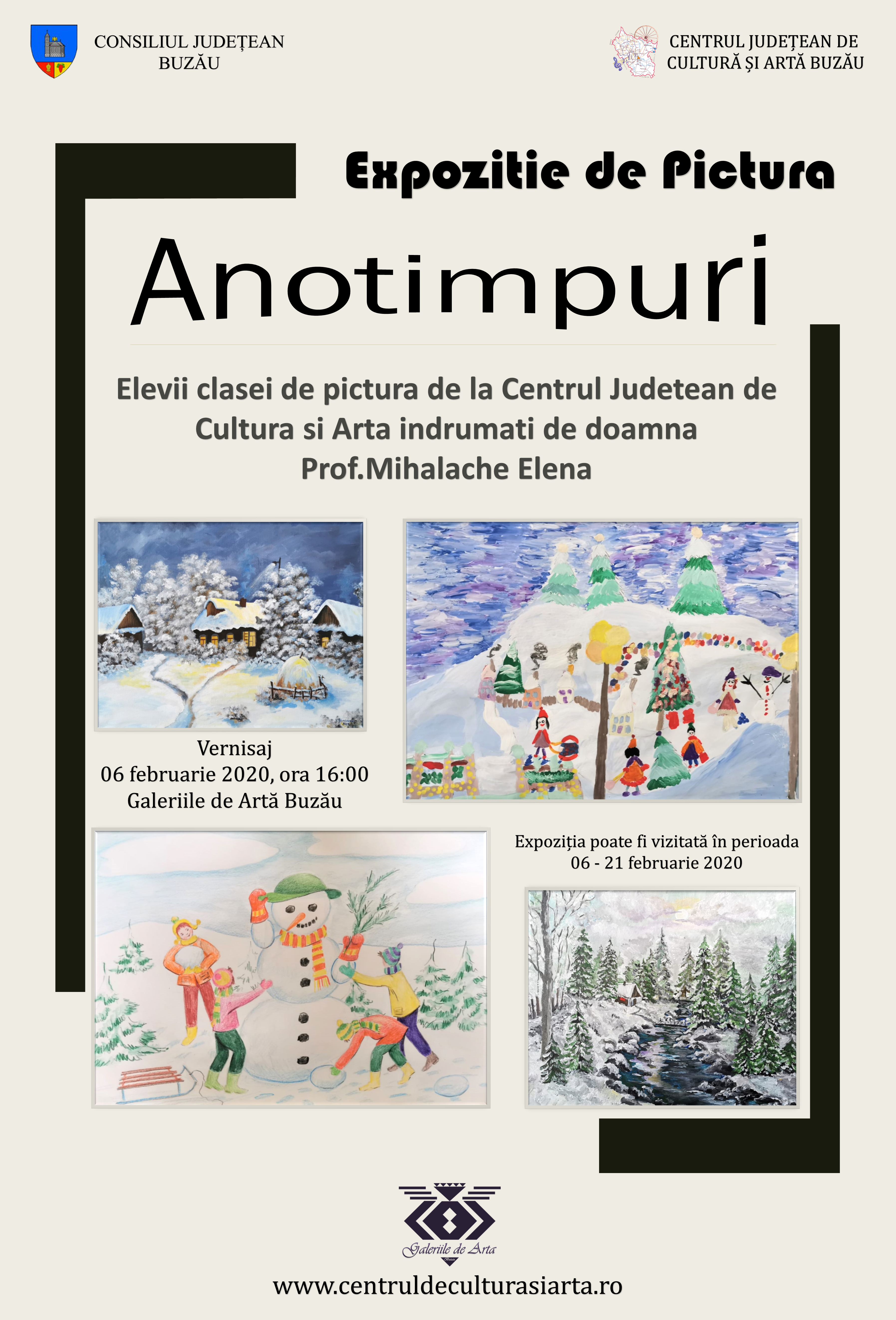 Elevii clasei de pictură de la Centrul Județean de Cultură și Artă Buzău îndrumați de Prof. Elena Mihalache își expun lucrările pe simeze la Galeriile de Artă Buzău. Vernisajul expoziției de pictură ,,ANOTIMPURI ” are loc pe 6 februarie 2020, ora 16:00. Expozitia va fi deschisă publicului până pe 21 februarie 2020.Expoziție ce trebuie vizitată, la Galeriile de Artă Buzău