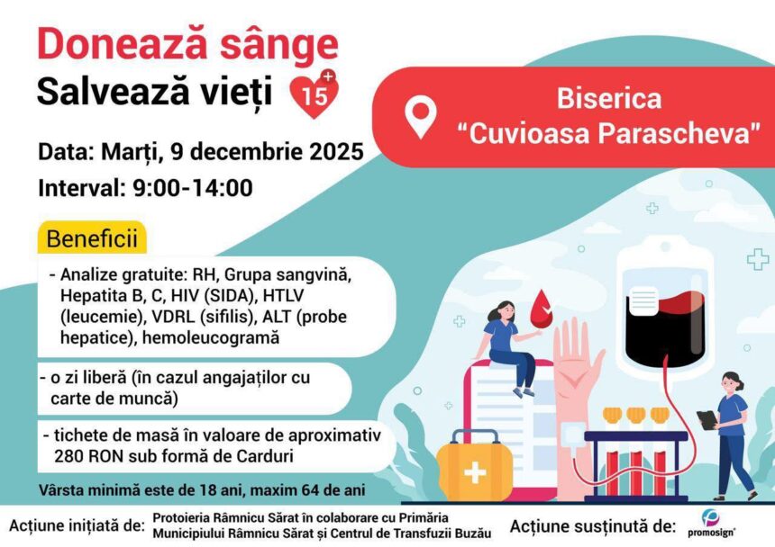 Acțiunea este organizată de Protoieria Râmnicu Sărat, în colaborare cu Primăria Municipiului Râmnicu Sărat și Centrul de Transfuzii Buzău.