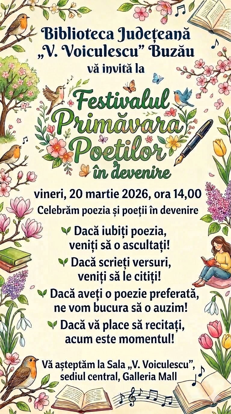 Biblioteca Judeţeană „V. Voiculescu” Buzău, instituţie aflată în subordinea Consiliului Judeţean Buzău, are plăcerea de a invita publicul și iubitorii de poezie, la o ediție specială a Festivalului „Primăvara Poeţilor”, aflat la a XVII-a ediţie, sub titlul Festivalul „Primăvara Poeților în Devenire”. Evenimentul va avea loc vineri, 20 martie 2026, începând cu ora 14:00, la sediul bibliotecii din incinta Galleria Mall (sala „V. Voiculescu”).