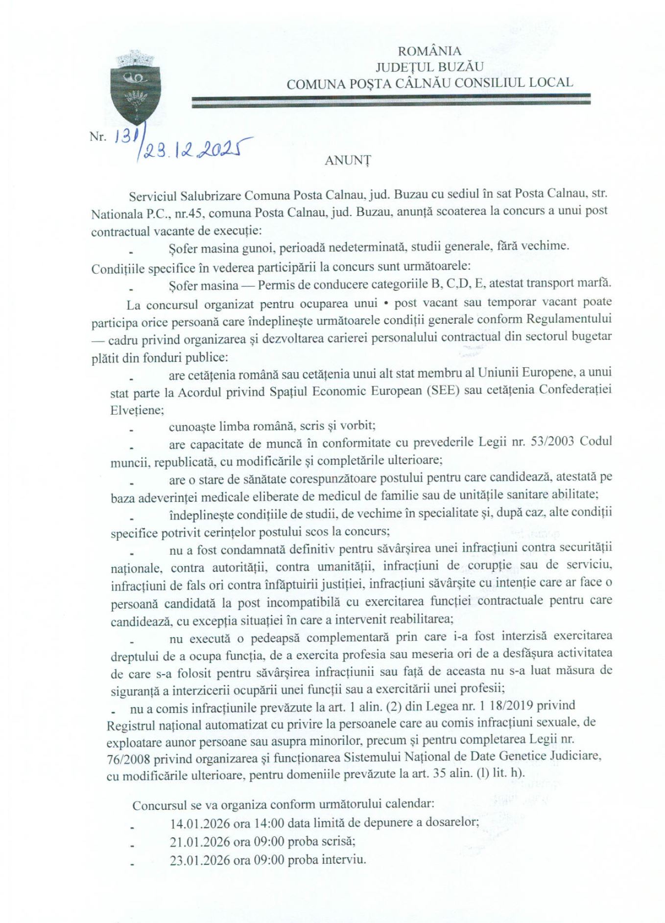 ANUNTURI BUZAUSTIRI BUZAU În atenția locuitorilor din Poșta Câlnău 24 decembrie 2025 de Stiri Buzau Media DISTRIBUIE Stiri Buzau Media 24 decembrie 2025 24 decembrie 2025 Articolul anterior Misiuni speciale ale oamenilor legii din Buzău, înainte de Crăciun! Buzăumedia pe Facebook Ultimele știri Misiuni speciale ale oamenilor legii din Buzău, înainte de Crăciun! STIRI BUZAU Restaurarea fostei închisori din Rm. Sărat riscă să rămână blocată! STIRI BUZAU Au fost predate și ultimele 20 de microbuze destinate elevilor din județul Buzău! STIRI BUZAU Vali Robu, atacantul Metalului Buzău, pe lista de transferuri a lui Dinamo! STIRI BUZAU Primăria Glodeanu Sărat: INFORMARE METEOROLOGICĂ – COD GALBEN DE VISCOL ADMINISTRATIV STIRI BUZAU Andi Cristea: De astăzi, se circulă neîntrerupt pe autostradă de la București la Adjud POLITICA STIRI BUZAU Constantin Toma: Este perioada colindelor! ADMINISTRATIV STIRI BUZAU Conferință ordinară a Consiliului Local Municipal Râmnicu Sărat din data de 23 decembrie 2025 ADMINISTRATIV STIRI BUZAU Primăria Scorțoasa: INFORMARE ADMINISTRATIV STIRI BUZAU Primăria Siriu: Iarna prinde viață pe scenă prin joc, colind și tradiție ADMINISTRATIV STIRI BUZAU