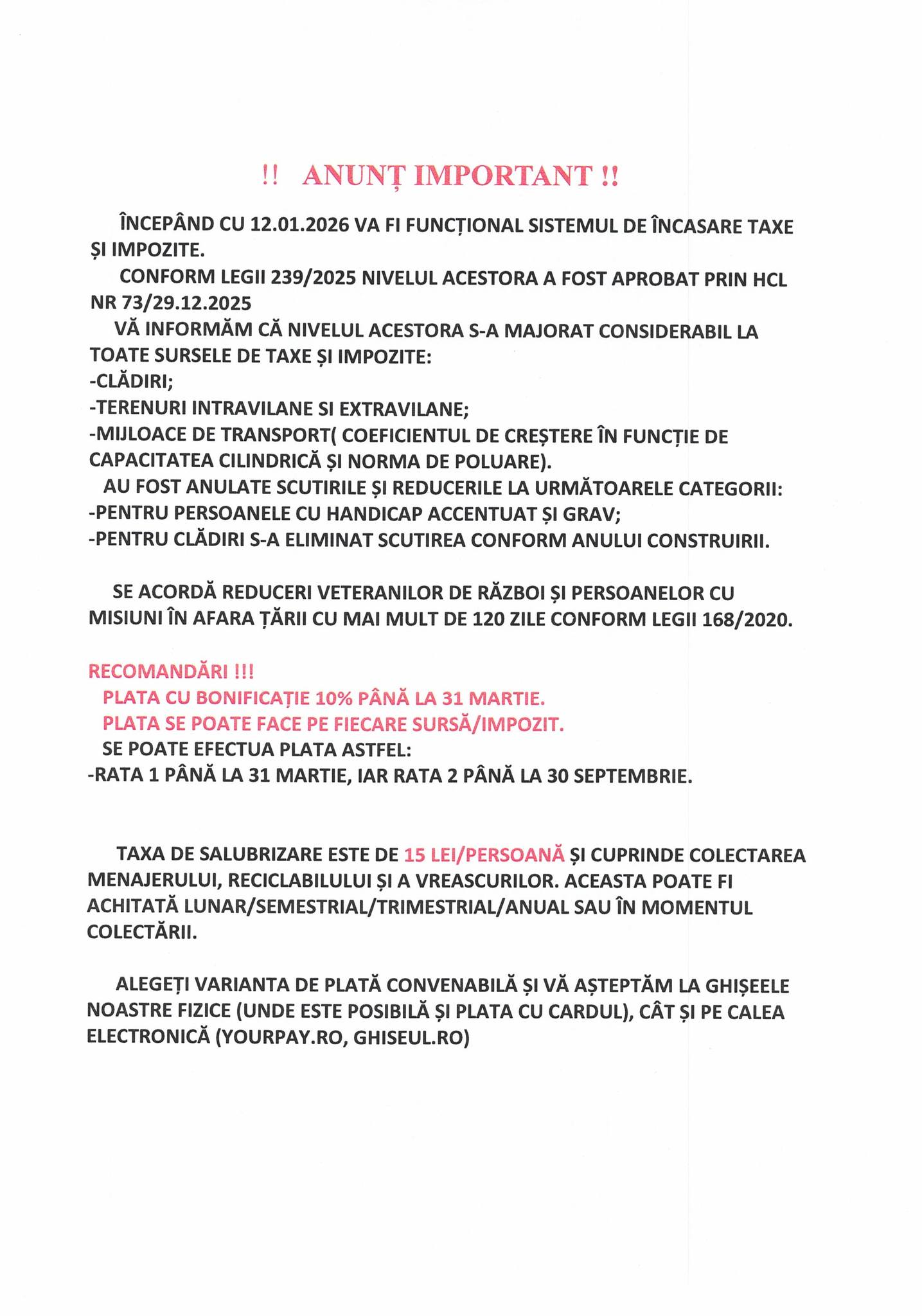 Rodica Bârlă: INFORMARE –PLATA TAXELOR ȘI IMPOZITELOR LOCALE 2026