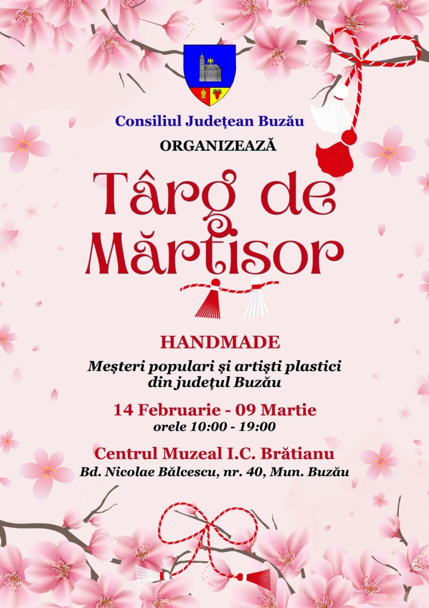 Consiliul Județean Buzau organizează în perioada 14 Februarie – 9 Martie 2026, la Centrul Muzeal I.C. Bratianu, Târgul de Mărțișor. Vor fi prezenți meșteri populari și artiști plastici buzoieni.