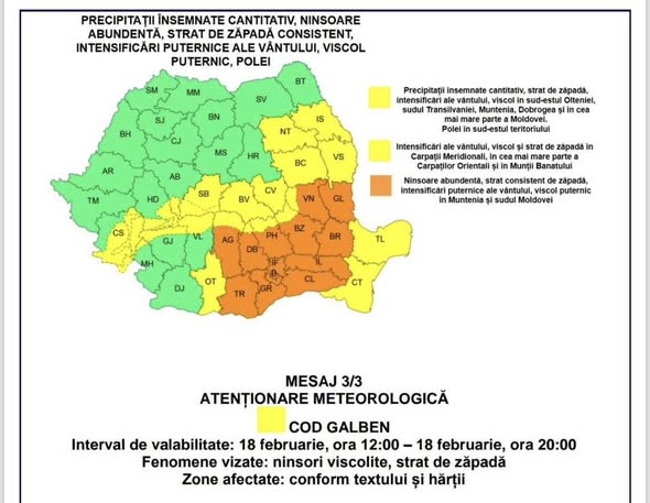 20–50 cm, rafale de vânt de 60–85 km/h și vizibilitate redusă sub 50 de