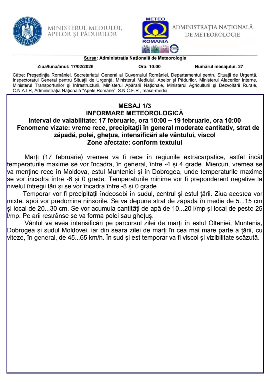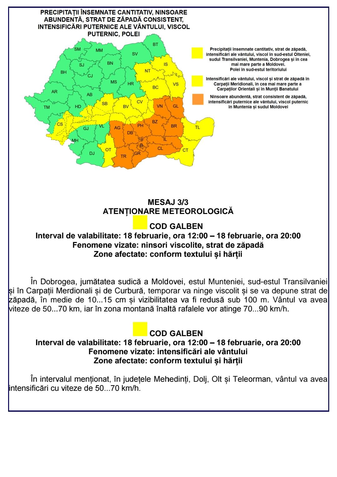 Administrația Națională de Meteorologie a emis, marți dimineață, mai multe avertizări de vreme severă, valabile începând de astăzi, care vizează ninsori abundente, viscol și intensificări puternice ale vântului în numeroase zone din țară. Cea mai severă avertizare este un Cod portocaliu, valabil din 17 februarie, ora 20:00, până pe 18 februarie, ora 12:00. În acest interval, în Muntenia și în sudul Moldovei sunt prognozate ninsori abundente, care vor duce la depunerea unui strat consistent de zăpadă, cu grosimi cuprinse între 20 și 50 de centimetri (echivalentul a 20–50 l/mp). Vântul va sufla cu putere, atingând la rafală viteze de 60–85 km/h, cele mai afectate urmând să fie județele Vrancea, Galați, Buzău, Brăila, Ialomița și Călărași. Meteorologii avertizează că va fi viscol puternic, zăpada va fi troienită, iar vizibilitatea poate scădea sub 50 de metri. De asemenea, un Cod galben este în vigoare în intervalul 17 februarie, ora 10:00 – 18 februarie, ora 12:00, pentru sud-estul Olteniei, sudul Transilvaniei, Muntenia, Dobrogea și Moldova.
