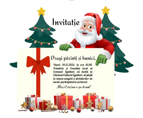 Vineri, 19 decembrie 2025, de la ora 16:00, la Căminul Cultural din Lopătari.