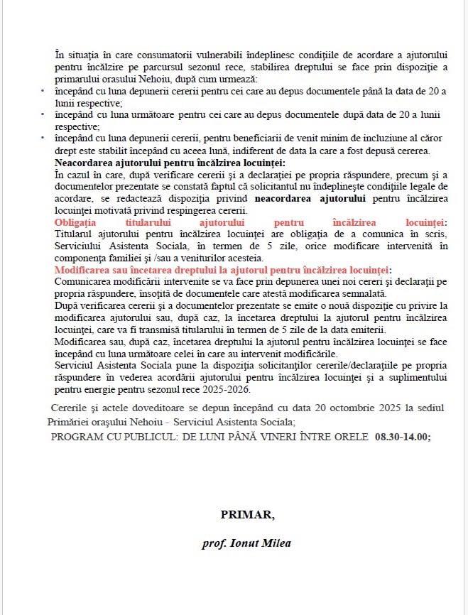 Începând cu data de 20 Octombrie 2025, se pot depun cererile pentru acordarea ajutorului de încălzire şi a suplimentului pentru energie pentru sezonul rece 2025-2026.