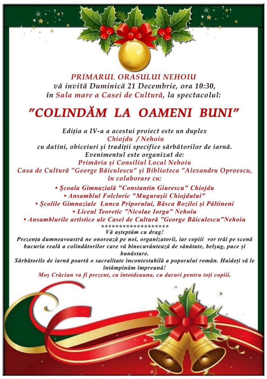 Vă invităm la spectacolul anual de Crăciun, ”Colindăm la oameni buni”, ediția aceasta fiind în parteneriat cu vecinii de la Chiojdu.