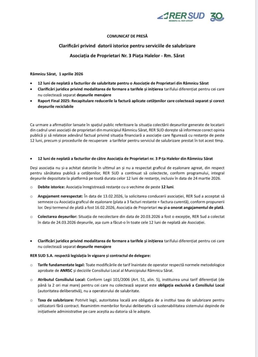 Clarificări privind datorii istorice pentru serviciile de salubrizare – Asociația de Proprietari Nr. 3 Piața Halelor – Rm. Sărat