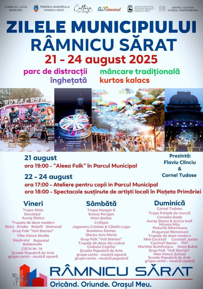 Primăria Municipiului Râmnicu Sărat, Consiliul Local Municipal, Centrul Cultural „Florica Cristoforeanu” și Muzeul Municipal „Octavian Moșescu”, vă invită la ZILELE MUNICIPIULUI RÂMNICU SĂRAT, în perioada 21 – 24 august 2025.