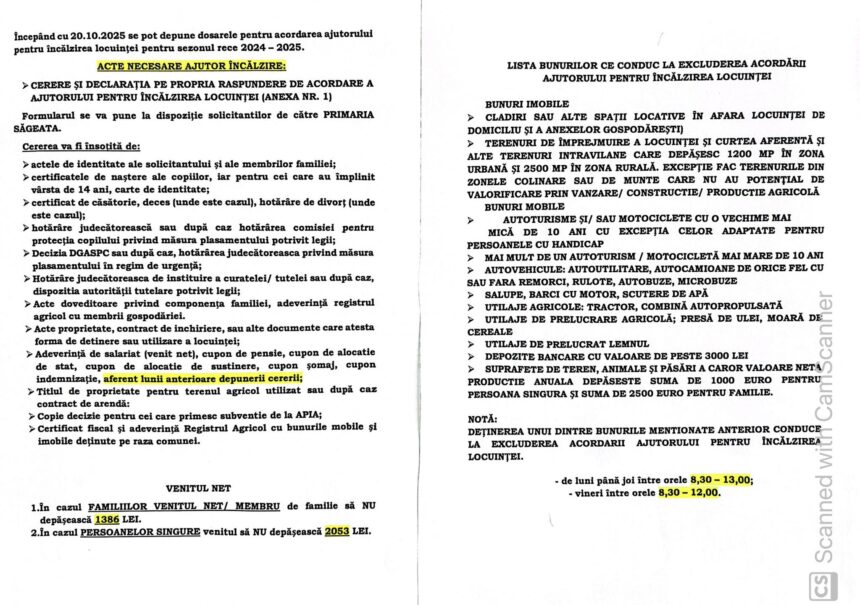 Primăria Săgeata: Ajutor încălzire sezon rece!