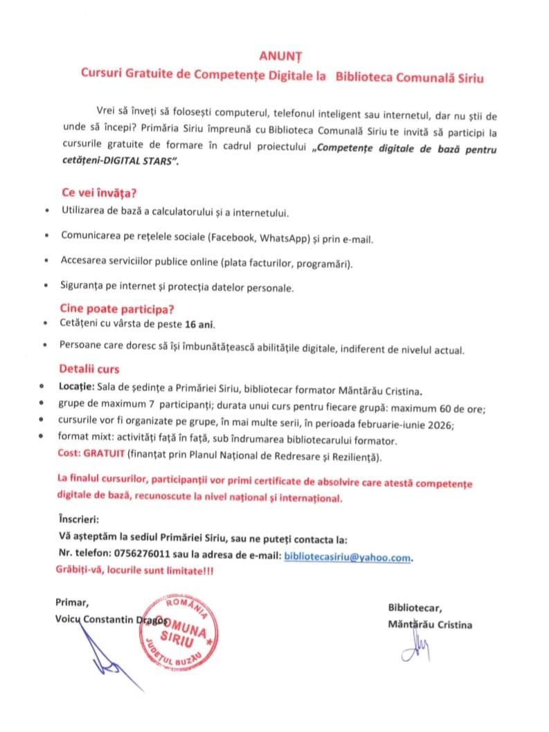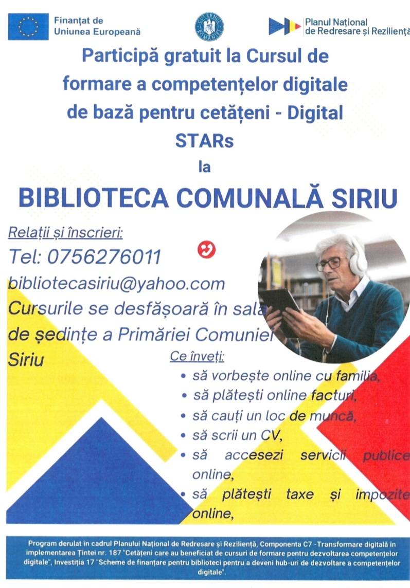 Primăria Siriu împreună cu Biblioteca Comunală Siriu te invită să participi la cursurile gratuite de formare în cadrul proiectului „Competențe digitale de bază pentru cetățeni-DIGITAL STARS”.