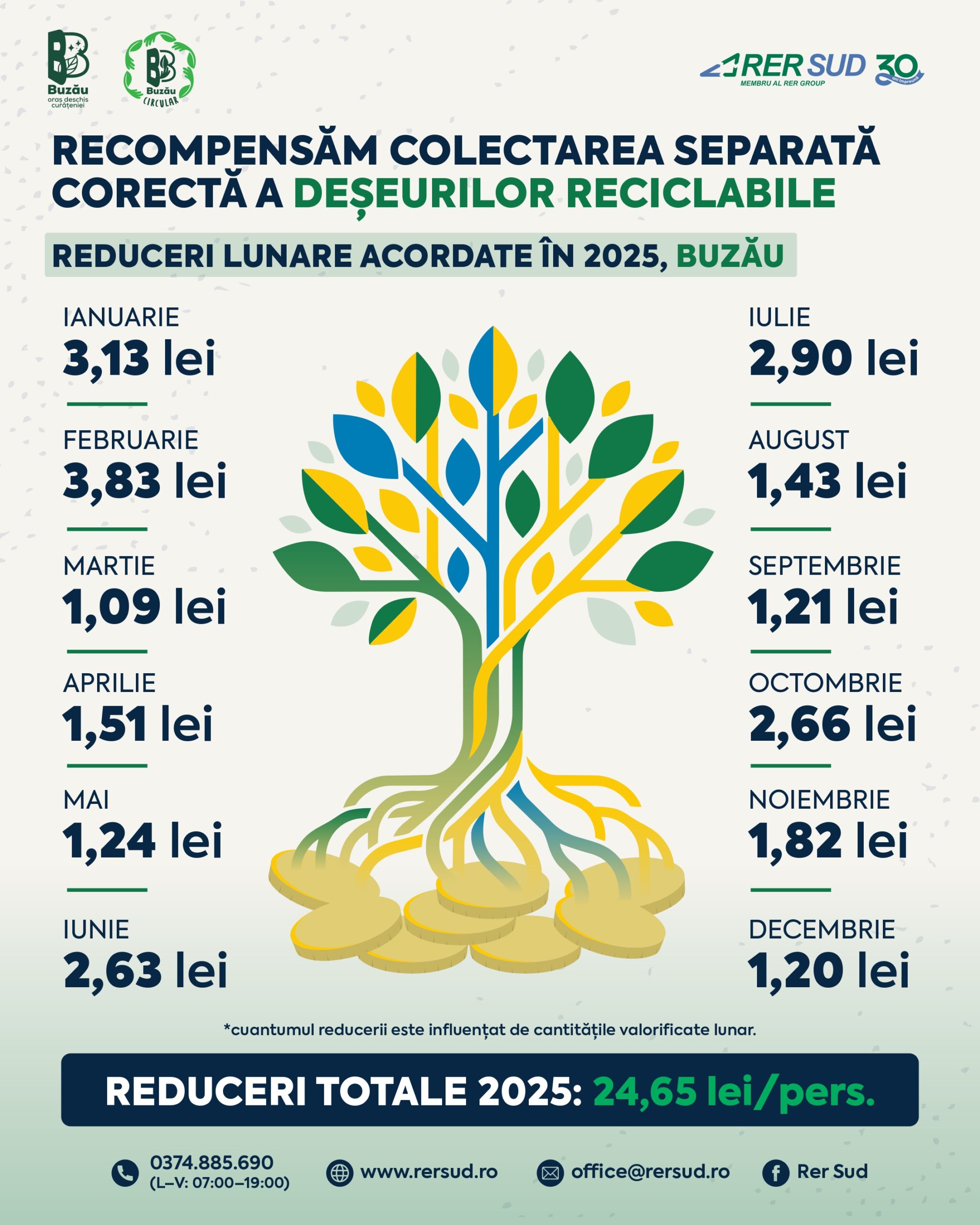 În fiecare lună a anului 2025, buzoienii au regăsit pe factură o reducere aplicată la tariful de colectare a deșeurilor calculată în funcție de sumele încasate din valorificarea deșeurilor reciclabile colectate separat de la aceștia. Valoarea totală a reducerii aplicate la factura lunară pentru anul 2025 a fost de 24,65 lei/persoană, iar media lunară a reducerilor a fost de 2,05 lei/persoană.