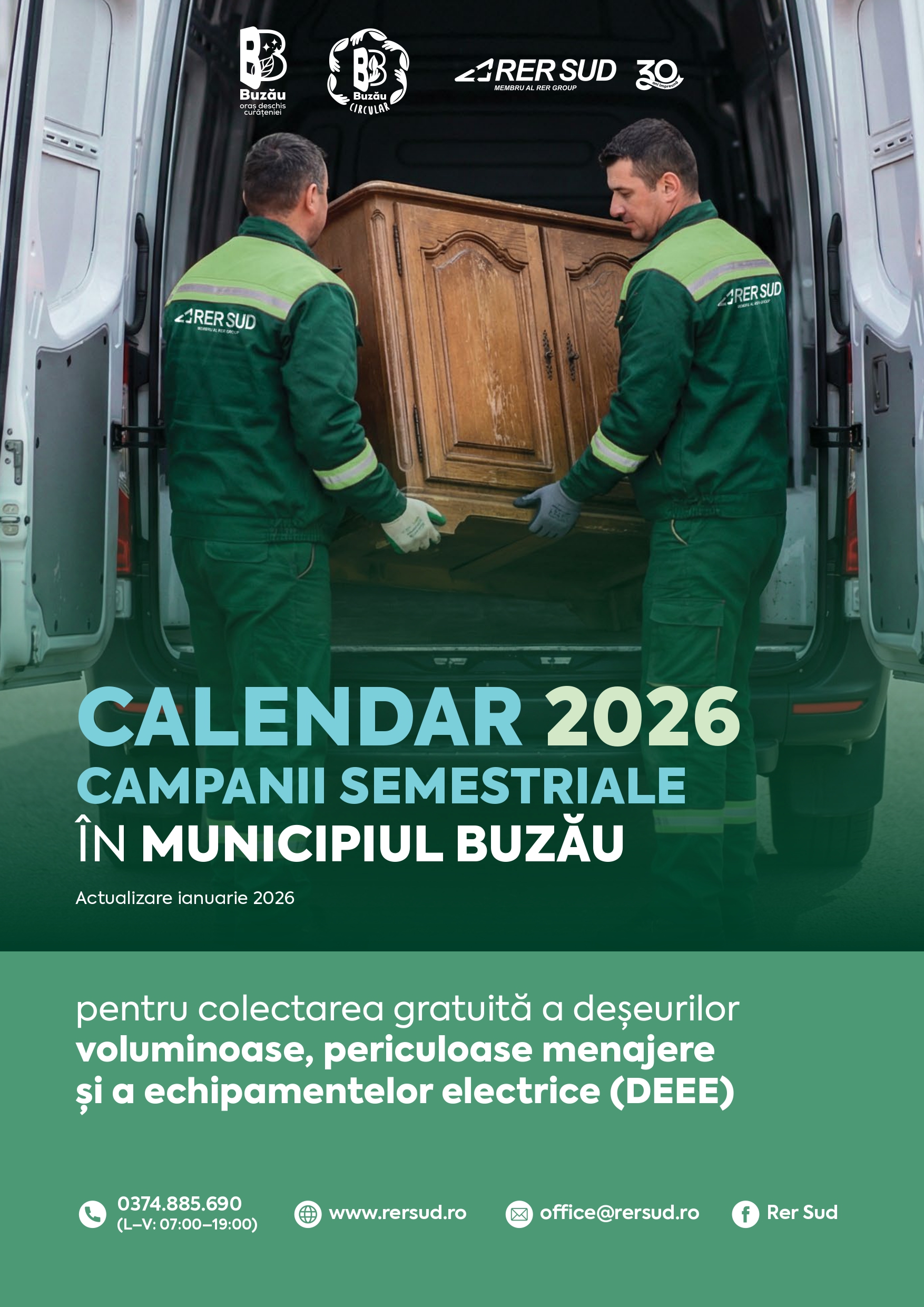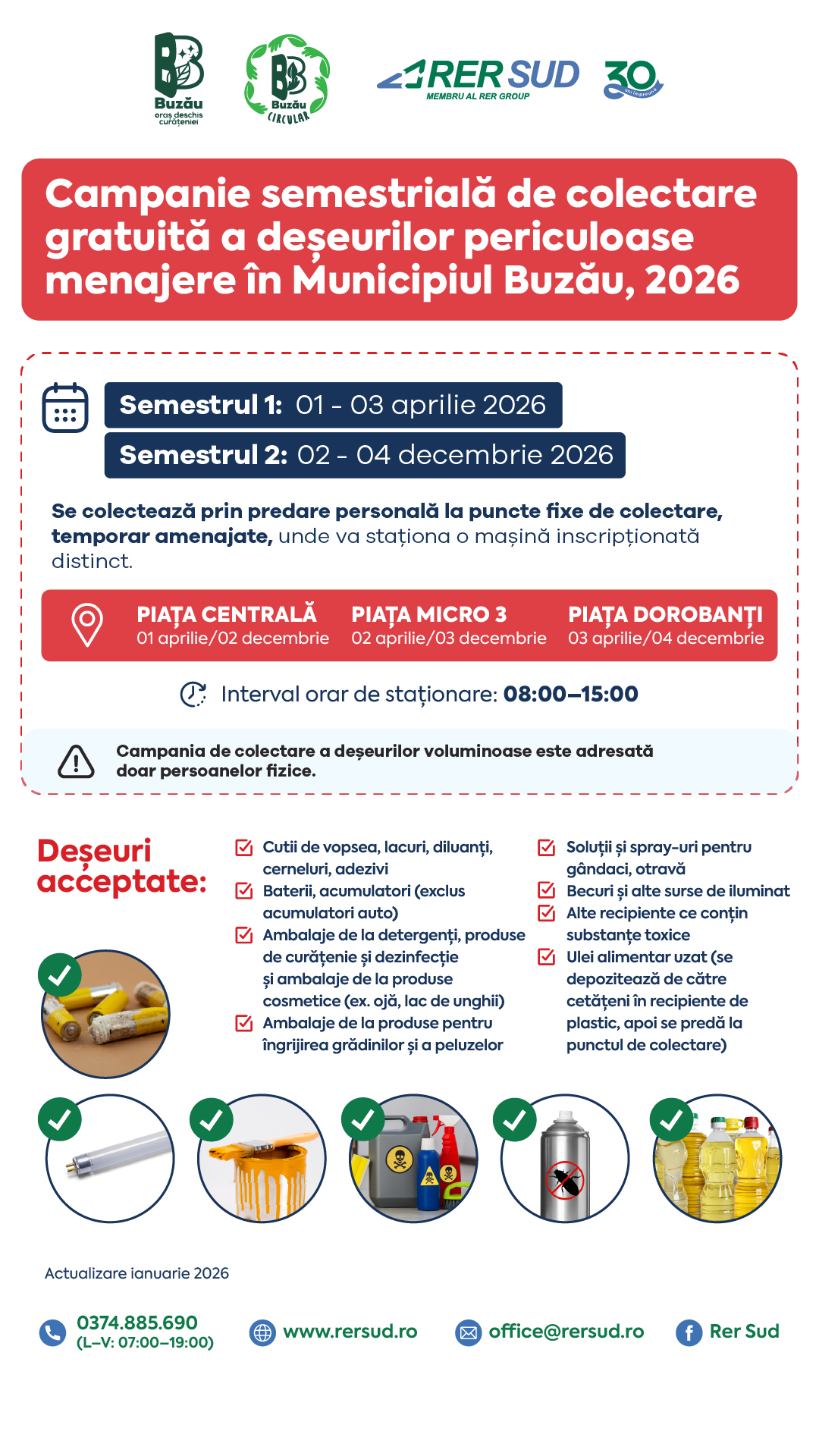 RER SUD S.A., în calitate de unic operator de salubritate pe raza municipiului Buzău, în conformitate cu prevederile contractului de delegare prin concesiune a gestiunii serviciului public de salubrizare nr. 17652 din 06.02.2023, a stabilit programul campaniilor semestriale dedicate colectării gratuite a deșeurilor voluminoase, precum și a deșeurilor periculoase provenind din deșeuri menajere generate de populația municipiului Buzău, pentru anul 2026, astfel: