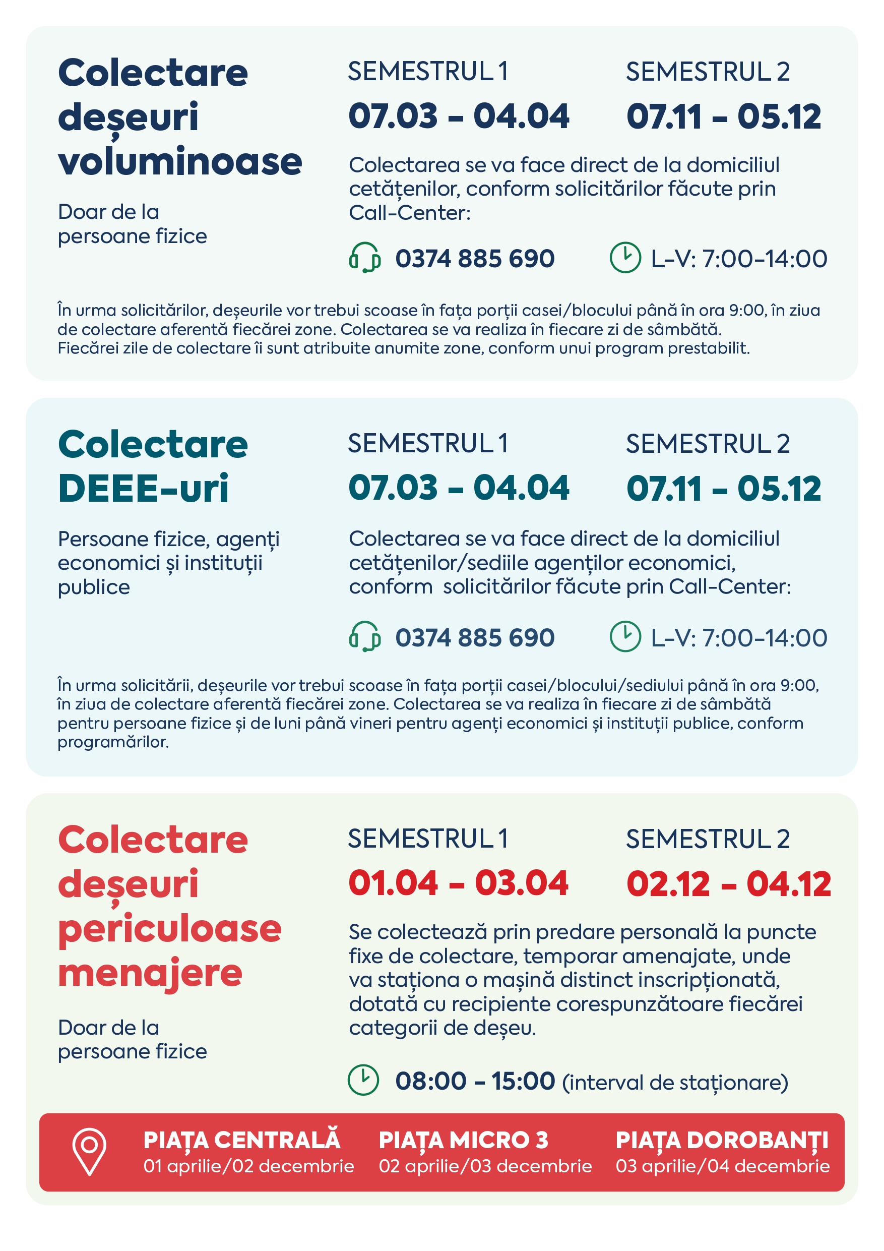 | Campanii deșeuri voluminoase | 7 Martie – 4 Aprilie | 7 Noiembrie – 5 Decembrie |