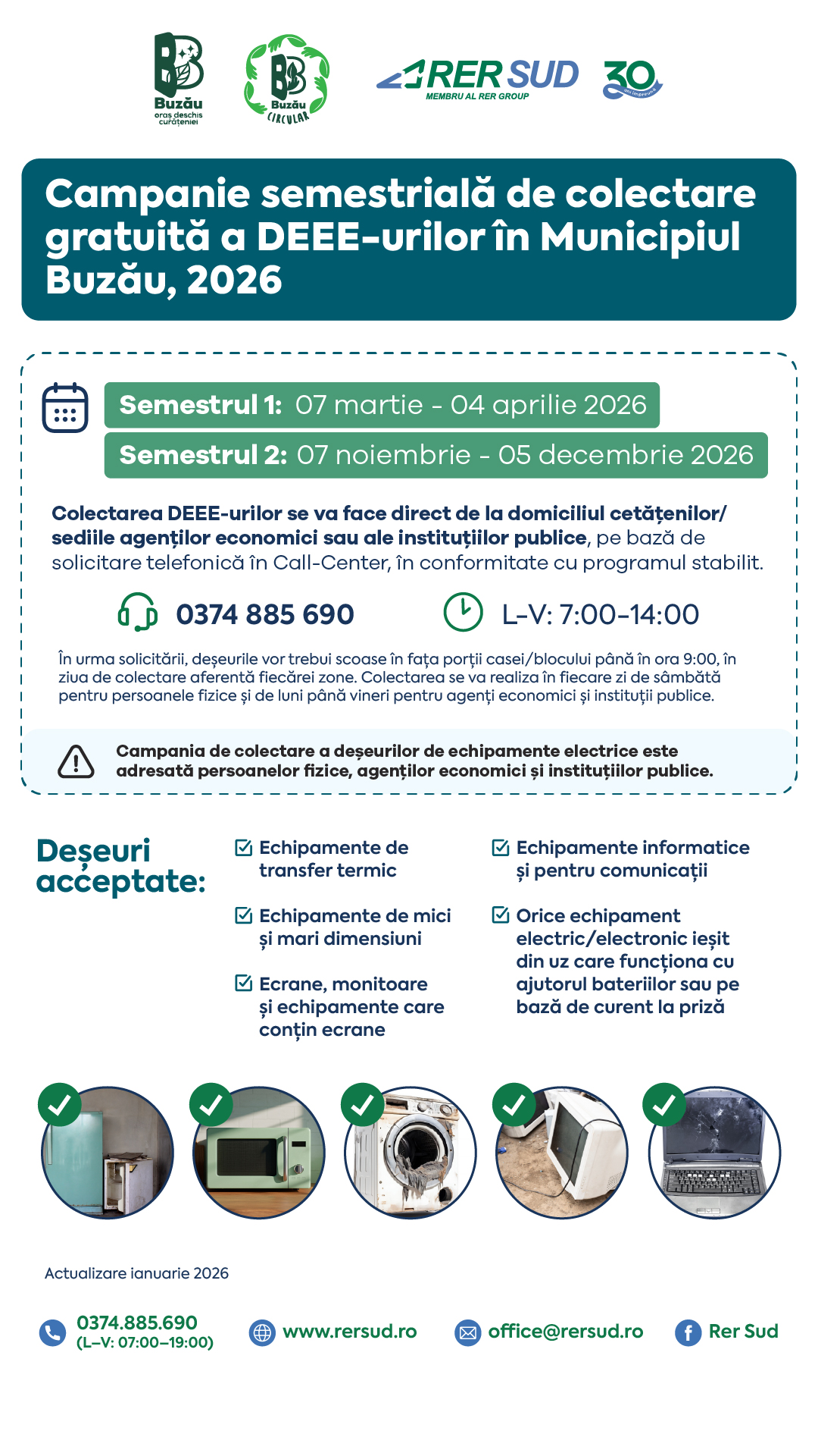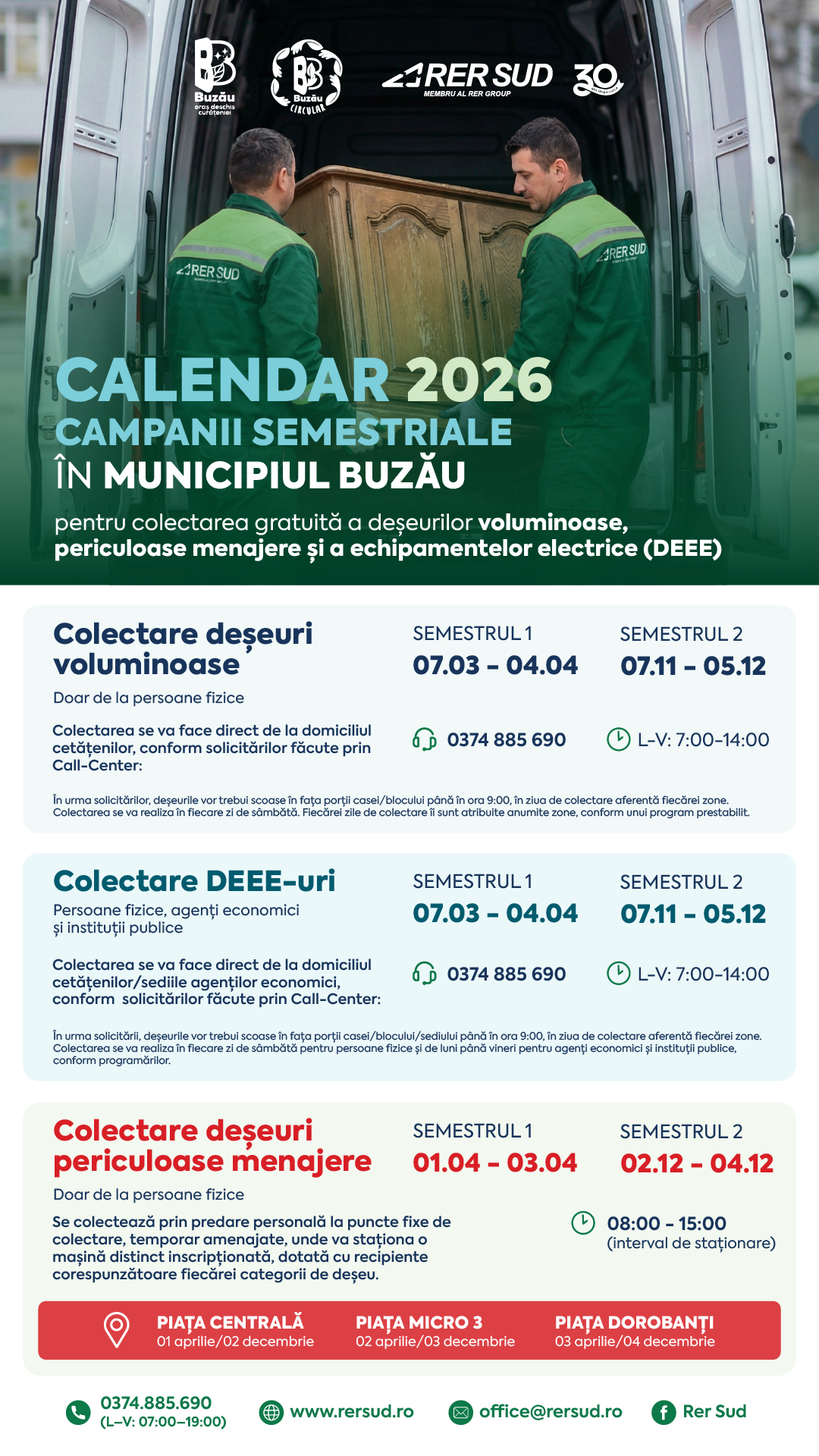 - RER SUD anunță programul anual al campaniilor semestriale dedicate colectării gratuite a deșeurilor voluminoase, periculoase menajere și a celor din echipamente electrice în municipiul Buzău