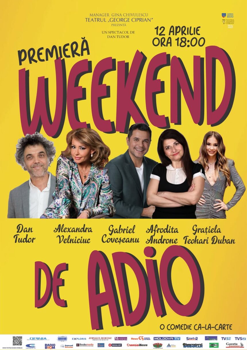Revenirea lui Dan Tudor pe scena Teatrului George Ciprian, ca regizor și actor al noii premiere WEEK-END DE ADIO, reprezintă o garanție a succesului de public. Acompaniat de o echipă de actori de calibru: Alexandra Velniciuc, Gabriel Coveșeanu, Afrodita Androne și Grațiela Teohari-Duban, efervescentul regizor ne promite O COMEDIE CA-LA-CARTE, in care aventurile amoroase, răsturnările de situație și autenticul interpretărilor vor reprezenta deliciul spectatorilor.