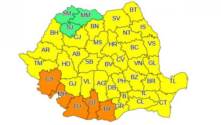 Prima atenţionare cod galben va intra în vigoare astăzi la ora 10 şi vizează Banatul, Crişana, sudul Olteniei, sud-vestul Munteniei și local în Transilvania. Acolo, valul de căldură se va extinde, iar disconfortul termic va fi în accentuare. Temperaturile maxime se vor situa frecvent între 33 și 36 de grade, iar minimele nocturne vor fi de peste 20 de grade. Instabilitatea atmosferică va fi accentuată miercuri (28 iunie), pe arii restrânse, mai ales la munte, în est și sud-est. Astfel, vor fi intervale de timp cu averse torențiale, frecvente descărcări electrice, intensificări de scurtă durată ale vântului cu aspect de vijelie și căderi de grindină.