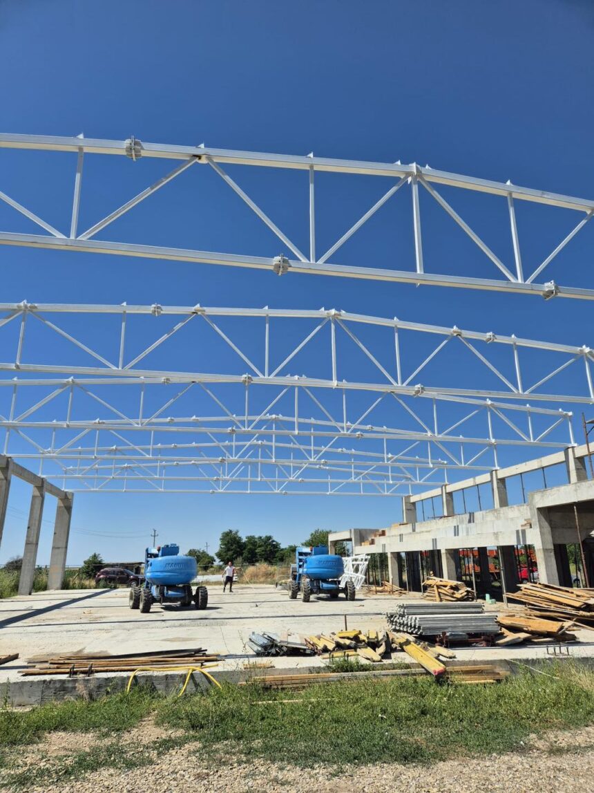Structura metalică a fost montată, iar echipele de muncitori lucrează în