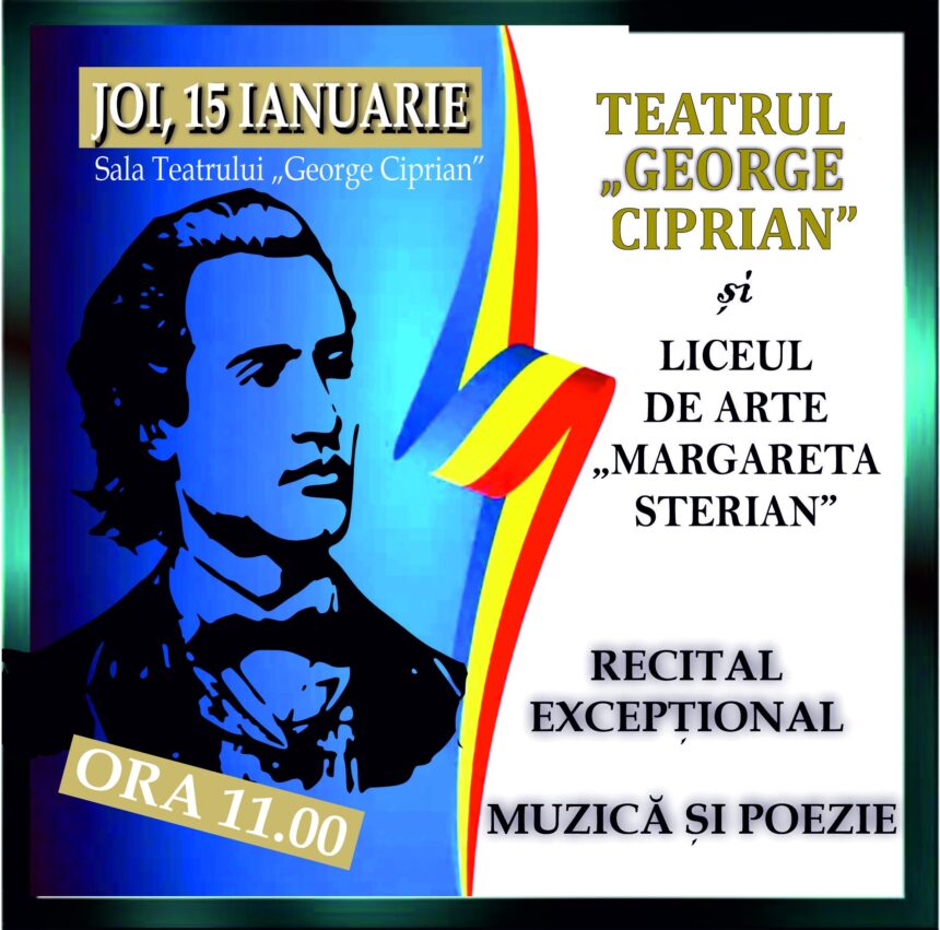 Miercuri, 15 ianuarie, de la ora 11.00, publicul iubitor de muzică și poezie, dar nu numai, este invitat la Teatrul „George Ciprian, sala „Paul Ioachim”, pentru un recital excepțional de muzică și poezie!