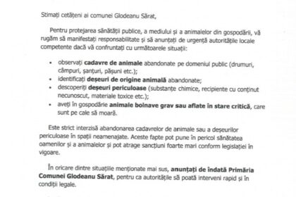 Primăria comunei Glodeanu Sărat aduce la cunoștință cetățenilor că în data de…