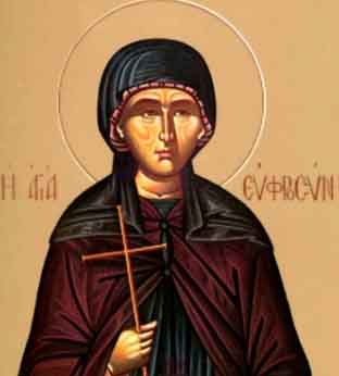 Sfânta Cuvioasă Eufrosina a trăit timp de 38 de ani într-o mănăstire de călugări, dându-se drept famen împărătesc, cu numele de Smarald, pentru a fugi de mirele impus de tatăl ei, Pafnutie, un om de rang înalt din cetatea Alexandriei. Sfânta Eufrosina avea 18 ani şi împărat era în vremea aceea Teodosie cel Mic (408-450). În mănăstire s-a nevoit în osteneli şi rugăciuni neîncetate, ascunsă de tatăl său. Din iconomia lui Dumnezeu, în timp ce se chinuia cu boala care i-a adus mutarea la cele veşnice, tatăl ei a venit în mănăstirea aceea. Atunci şi-a mărturisit fraţilor şi tatălui său taina ascunsă atât timp. La scurt timp a şi plecat la Domnul. Minunat de acestea, Pafnutie a rămas în chilia fiicei sale, împărţindu-și averea săracilor.